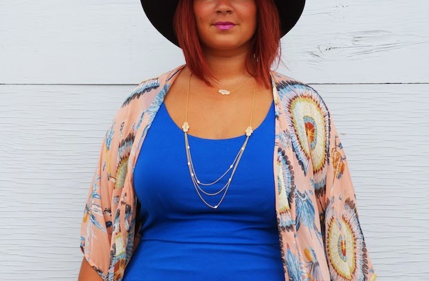Printed Kimno: UMGEE USA | Dress: ASOS Curve | Sandals: Charlotte Russe | Handbag: Remi & Reid | Cuff: Child of Royals | Necklaces/Rings: Freida Rothman | Floppy Hat: Forever 21